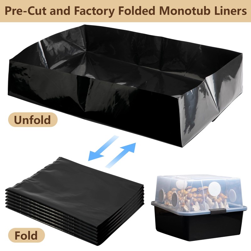 - Excellent performance:Monotub liner provides an extra layer of insulation to maintain the stable temperature and humidity needed for mushroom growth, and the black design effectively blocks light from touching the side of the substrate, allowing your spores to grow more evenly. Using them also makes post-harvest cleanup easy and simple.