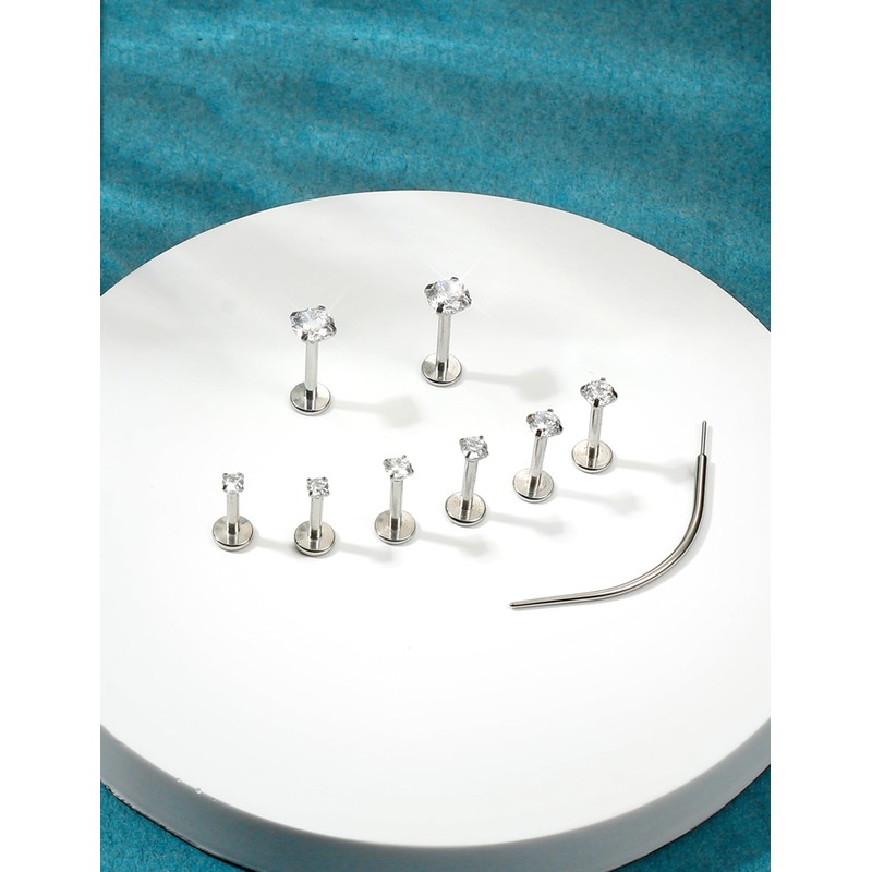 • Threadless push-in nose rings: gauge size: 16G (1.2mm) Bar length: 6mm/7mm/8mm, CZ diameter: 2mm, 2.5mm, 3mm, 4mm. Colour: silver. Material: 316L Stainless Steel One order contains 8 labret pins (3 different lengths), 8 threadless ends in different sizes and 1 piercing taper insertion pin. You can combine different sizes of the zirconia heads and different lengths of the pins as desired.