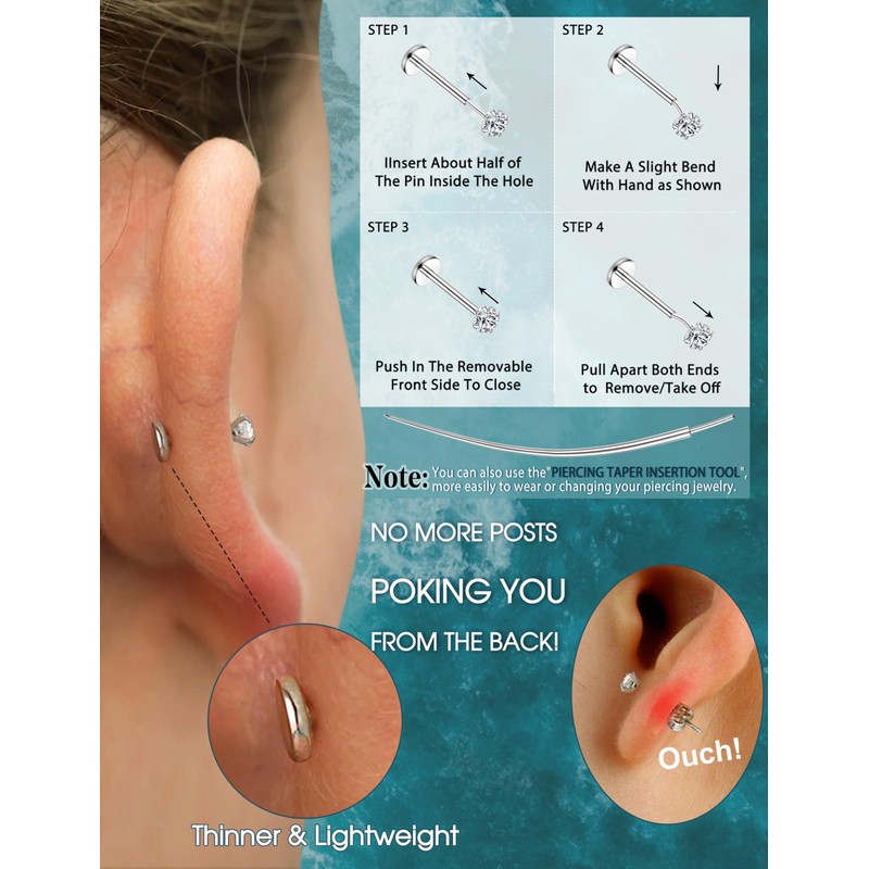 • No more worries about the length: we offer the 3 most popular labret bar lengths (6/7/8 mm). These cartilage piercing jewellery can be used as cartilage studs, helix earrings, daith piercing jewellery, tragus earrings for women, threadless nose studs and lip piercing jewellery. They can be worn in different areas of the ear, either individually or in layers. They can be worn on the ear lobe or in the second or even third ear piercing.