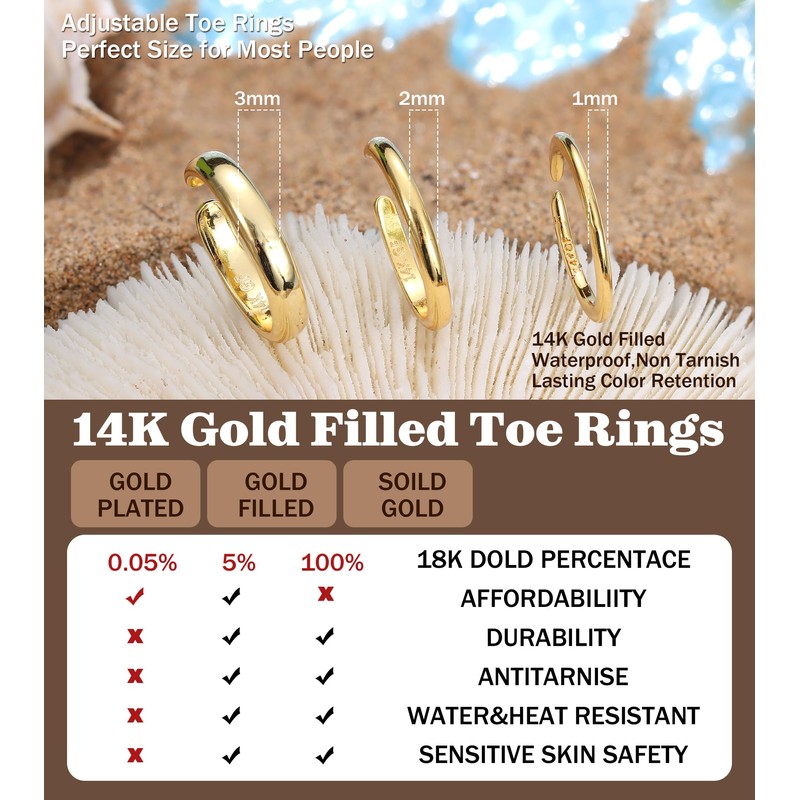 • 14K Gold Filled Toe Rings for Women--Upgraded 14K GOD FILLED,20 times plating thickness compared to ordinary gold plating.Non oxidation,tarnish,rust,and long-lasting brilliance.Perfect color on the gold, not fake or yellow looking at all