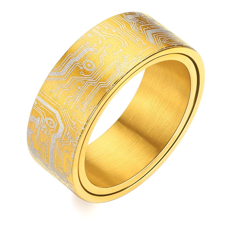 Adreamz 8mm Gold Spinner Computer Circuit Board Ring For Men Anxiety Fidget Relieving Gold Stainless Steel Ring Pipe Cut Edge Programmer Wedding Ring Size 9.5