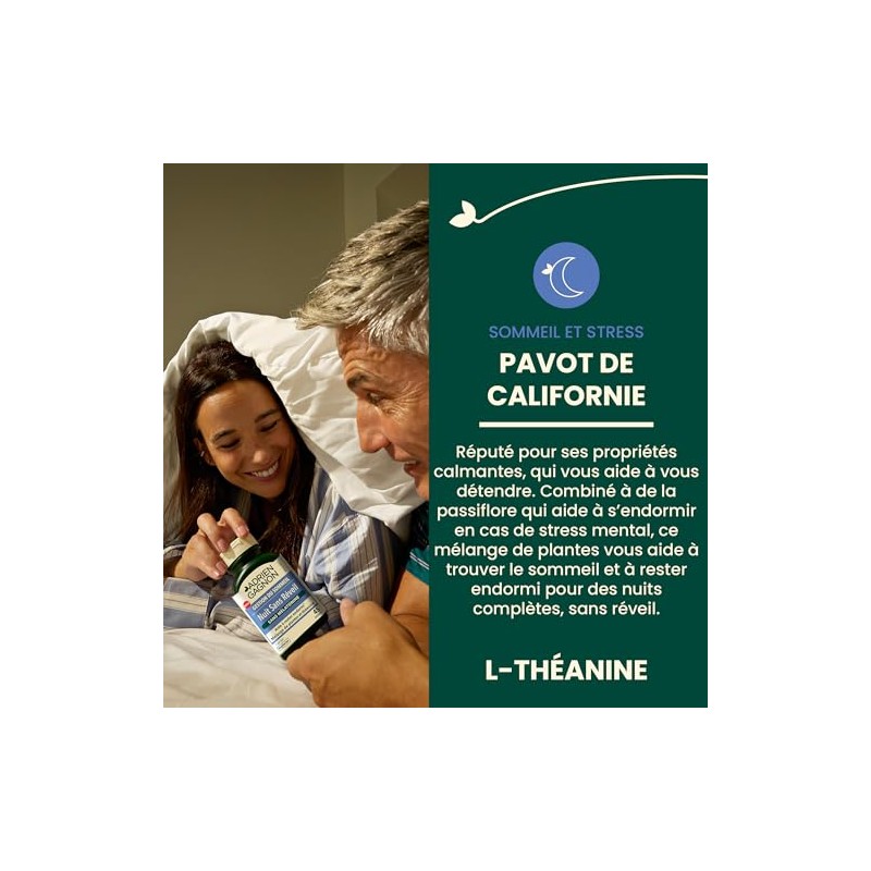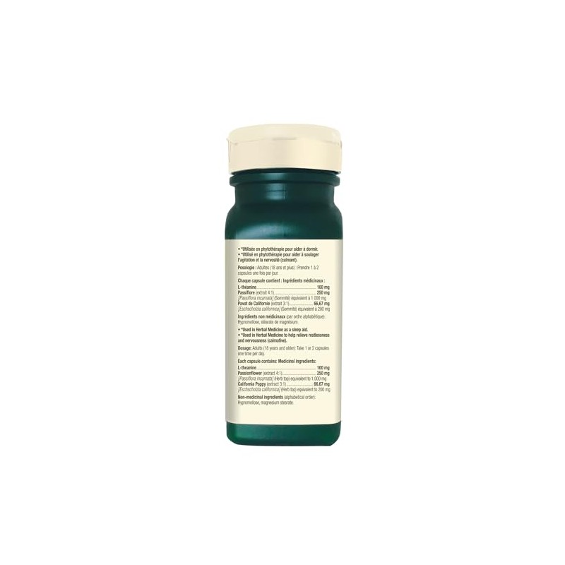 - This formula is composed of L-theanine, an amino acid naturally present in green tea, with highly relaxing effects, and two plants, passionflower and California poppy, recognized in herbal medicine for their calming and sedative properties, which work in synergy on the nervous system, notably at the level of the neurotransmitter GABA, which has an inhibitory and calming effect on the brain's synapses, moderating nervous signals and avoiding over-stimulation of the brain.