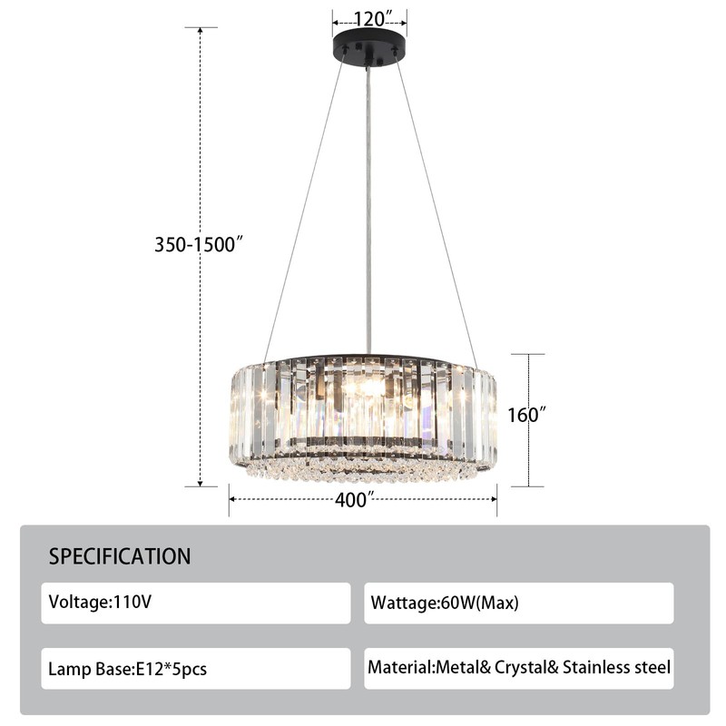 - 【Dimmable Switch & Bulb】5 x E12 bulbs,Crystal chandelier recommend E12 LED bulb bases. (Max 60-watt per bulb,Not Included).This modern chandelier is also compatible with dimmable bulbs, energy saving halogen bulbs