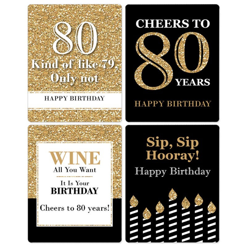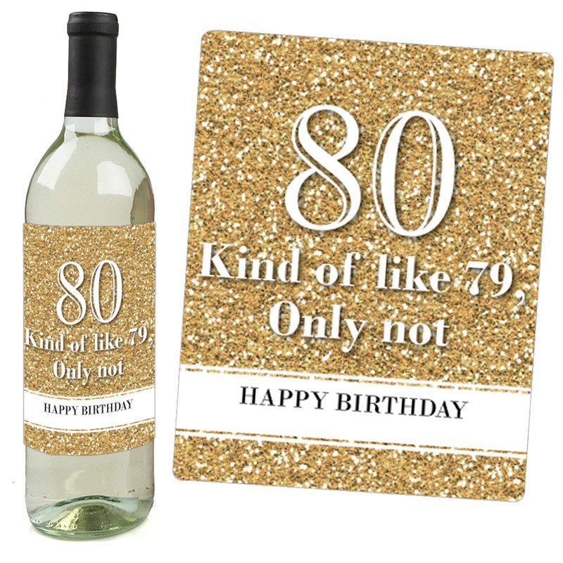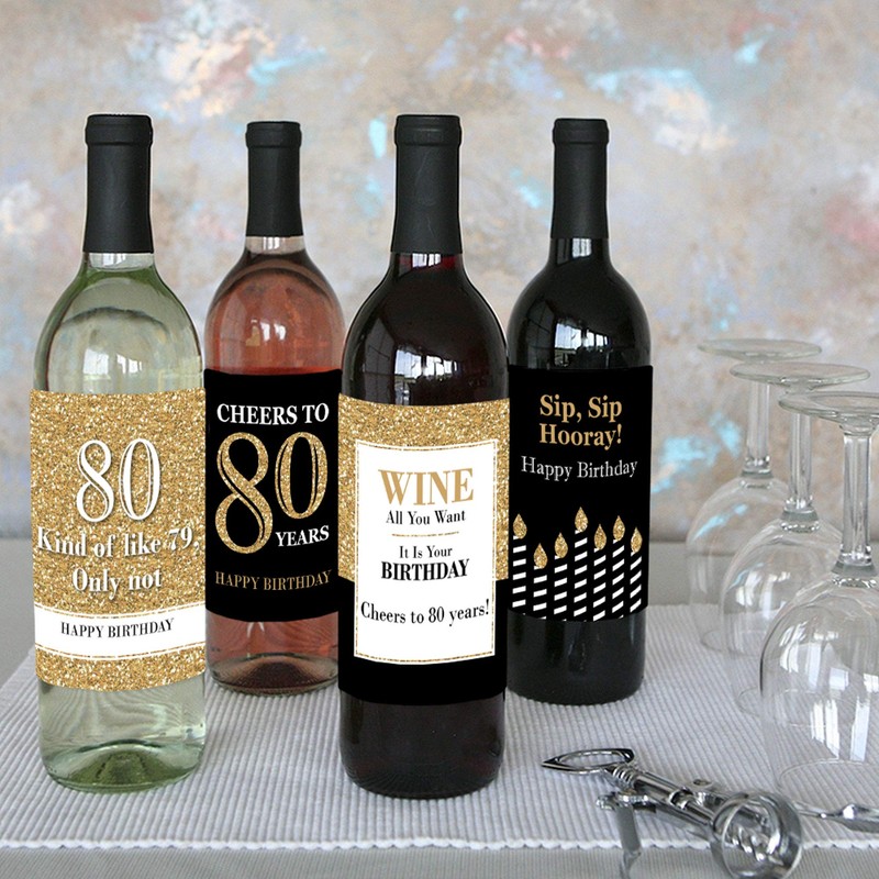 - UNIQUE BIRTHDAY GIFT IDEA: Black and gold Wine Bottle Labels also make a great gift idea. Add Adult 80th Birthday - Gold Wine Bottle labels to a favorite bottle of wine or spirits for a special birthday gift. Use each wine label on a favorite beverage bottle and gift individually or create an impressive birthday gift basket using all 4 labels on coordinating wine or liquor bottles. Wine bottle labels will easily give your birthday gift a personal touch!