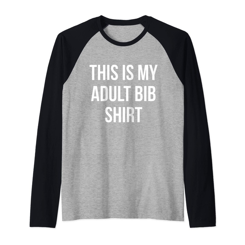 - A funny shirt for messy eaters, eating competitions, or teenagers, this shirt features the slogan, quote, phrase, or saying, "This Is My Adult Bib Shirt." Fun humorous sarcastic gag gift for office white elephant parties.
