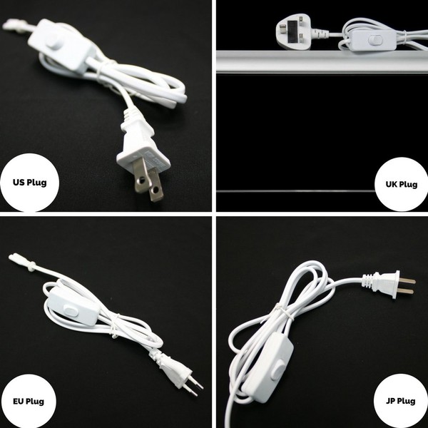 - Provide a 5 ft/ 1.5m white wire with ON/OFF switch function. (US plug 110v to USA & CA) (UK plug 240v to UK) (AU plug 240v to AU & NZ) (EU plug 240v to EU & other countries)