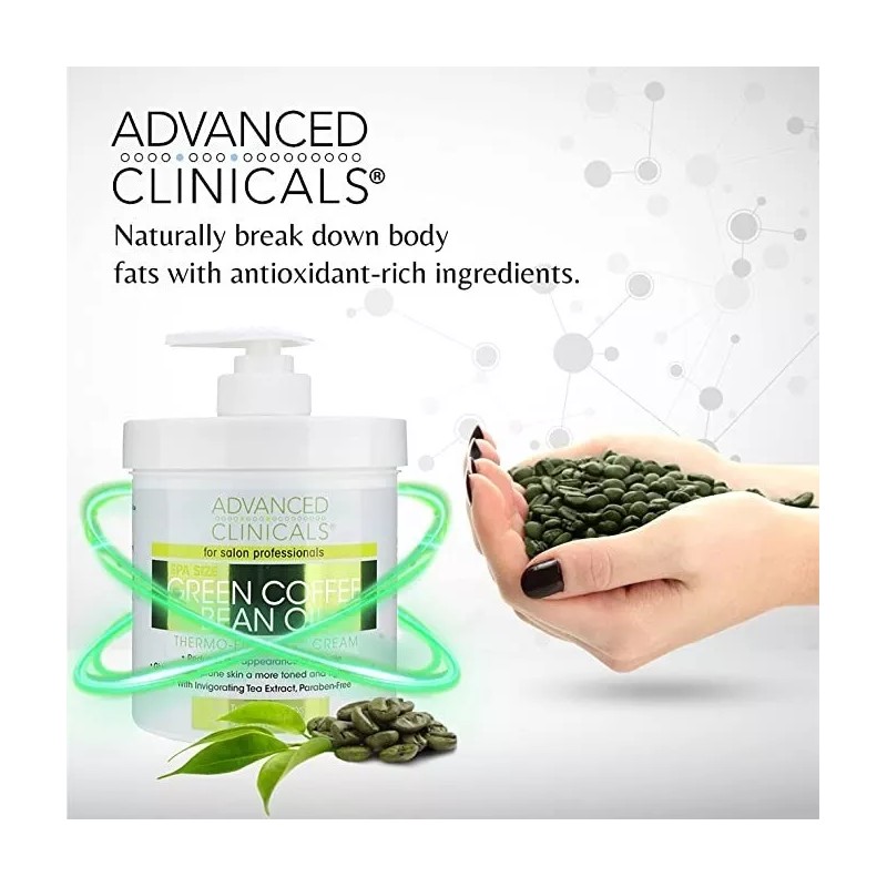 Vigoriza tu piel: devuelve la vida a tu cuerpo con tu crema adelgazante de aceite de grano de café verde de Advanced Clinicals Hidrata y tonifica tu barriga, piernas y cuerpo.