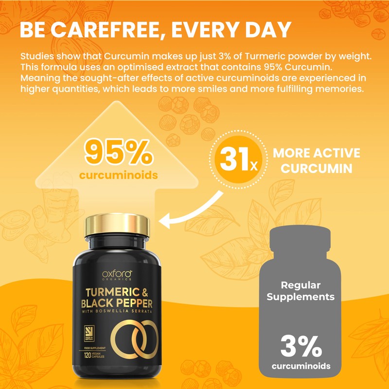 - ✔️ BE CAREFREE, EVERY DAY WITH UP TO 31X MORE ACTIVE CURCUMIN - Studies show that Curcumin makes up just 3% of Turmeric powder by weight. This formula uses an optimised extract that contains 95% Curcumin. This means the sought-after effects of active curcuminoids are experienced in higher quantities, which leads to more smiles and more fulfilling memories.