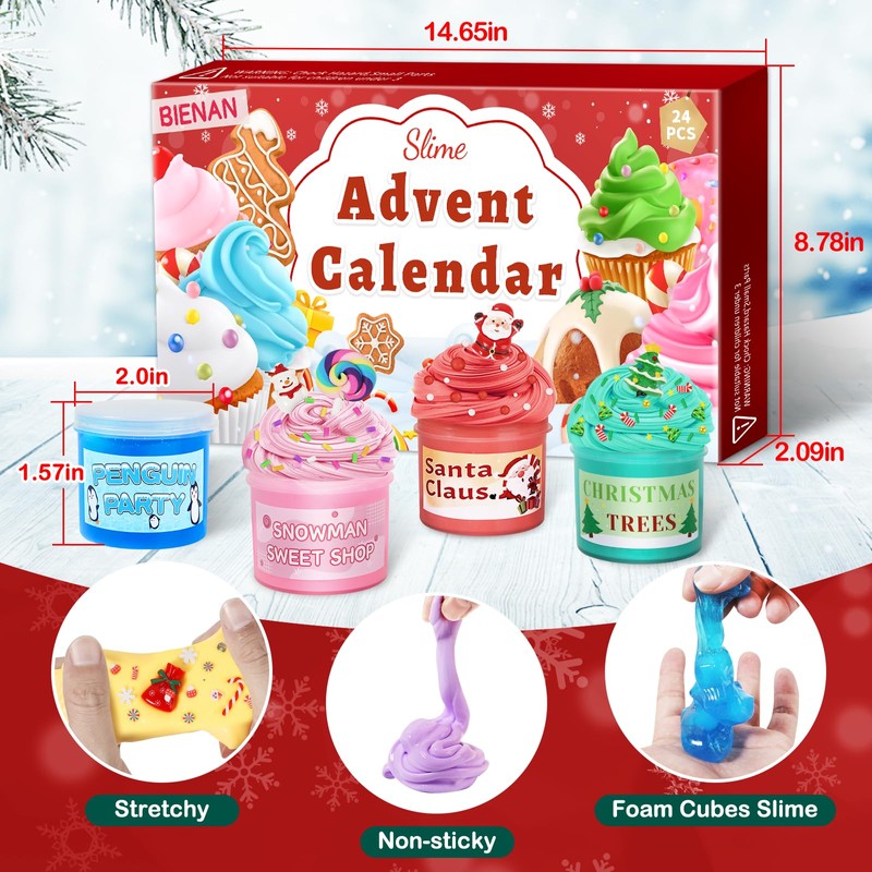 - [ Slime Christmas Advent Calendars 2024 ] - Christmas countdown is the most exciting time for children. Our 24 days Christmas Countdown Calendar box included 12 pots of slime with different Christmas elements and 12 pack Christmas themed accessories. Children can open a little door every day to obtain fluffy slime or cute charm toys! Mysterious gifts will surely impress your children! Have a ball with this fantastically slimy advent calendar!