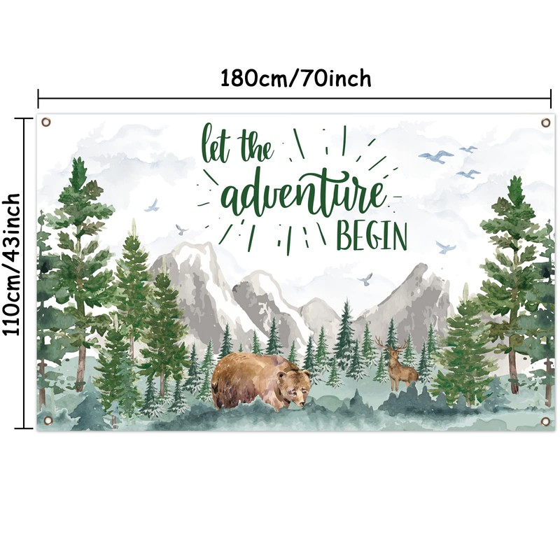 - 【Many Occasion】The backdrop can be used as photo backdrops, wall decor, cake table banner, celebration, photo studio photography, photo prop and so on. This adventure banner backdrop can perfectly fit for your other woodland party favors such as adventure awaits baby shower garland, balloons, tableware and any other wilderness adventure party supplies.