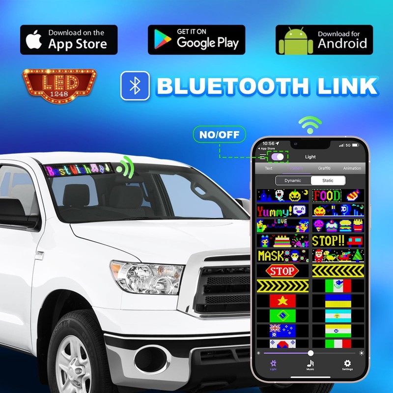 • Bluetooth Control Program: This car LED light sign is mainly controlled by connecting to a mobile phone via Bluetooth. Download the application on the mobile phone (supports Android and Apple systems) and you can operate the design on the mobile phone to display it on the LED display