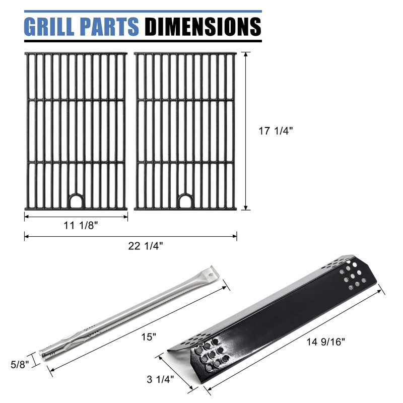 - ▶PRODUCT INFORMATION◀ -Grill Grate Dimensions: 17 1/4" x 11 1/8" for each, 17 1/4" x 22 1/4" for total, Material: Cast Iron. Grease Tray Dimensions: 23.6 to 31.6 inches in length, 15 inches in width, Material: Stainless Steel. Flame Tamer Dimensions: 14 9/16" x 3 1/4", Material: Procelain Steel. Grill Burner Dimensions: 15" x 5/8", Material: Stainless Steel.