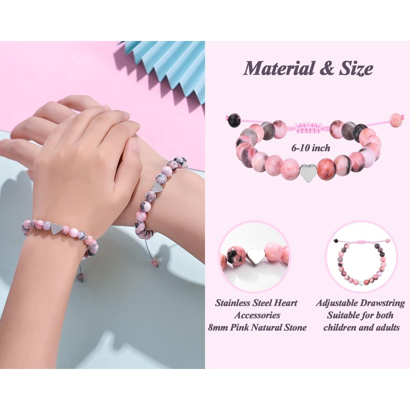 ADVIOK Gifts for Sister Sweet Heart Charm Natural Pink Stone Bracelet Adjustable for Girls Bestie Big Sister Little Sister Birthday Gift Christmas Jewellery
