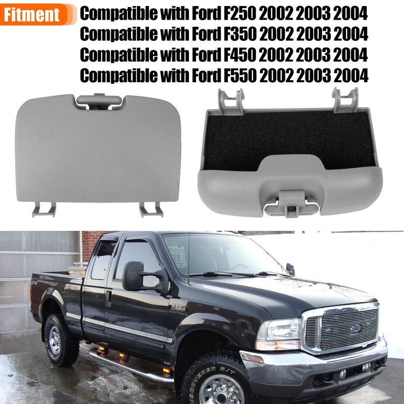 - 【Vehicles Compatibility】Compatible with Ford overhead sunglass console Super Duty F250 F350 F450 F550 roof console cover Harley-Davidson Edition, King Ranch, Lariat, XL, XLT 2002 2003 2004. Replace for OE: 2C3Z27811586BAA. The light gray color perfectly complements your vehicle's interior, making it an easy solution to fix your damaged overhead console storage compartment! Before placing your order, please carefully verify that the product matches your car's specific year and model.