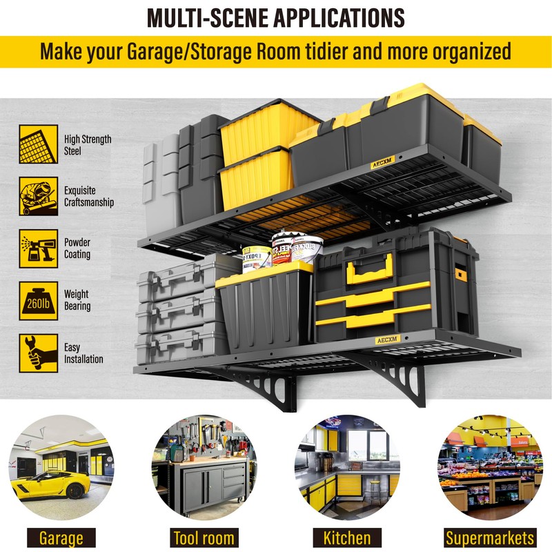 - STABLE AND SAFE: The parts of the wall mounted storage rack are independent of each other and can be well connected tightly, With balanced force and strong pressure resistance. The surface adopts professional fine sand grain high temperature powder coating, the whole flat, beautiful and solid, single piece of safe load-bearing up to 260 lbs; Wall-mounted storage racks allow you to organize the clutter on the ground to the wall space, Expanding the use of space, So that your garage/storage room is cleaner and tidier