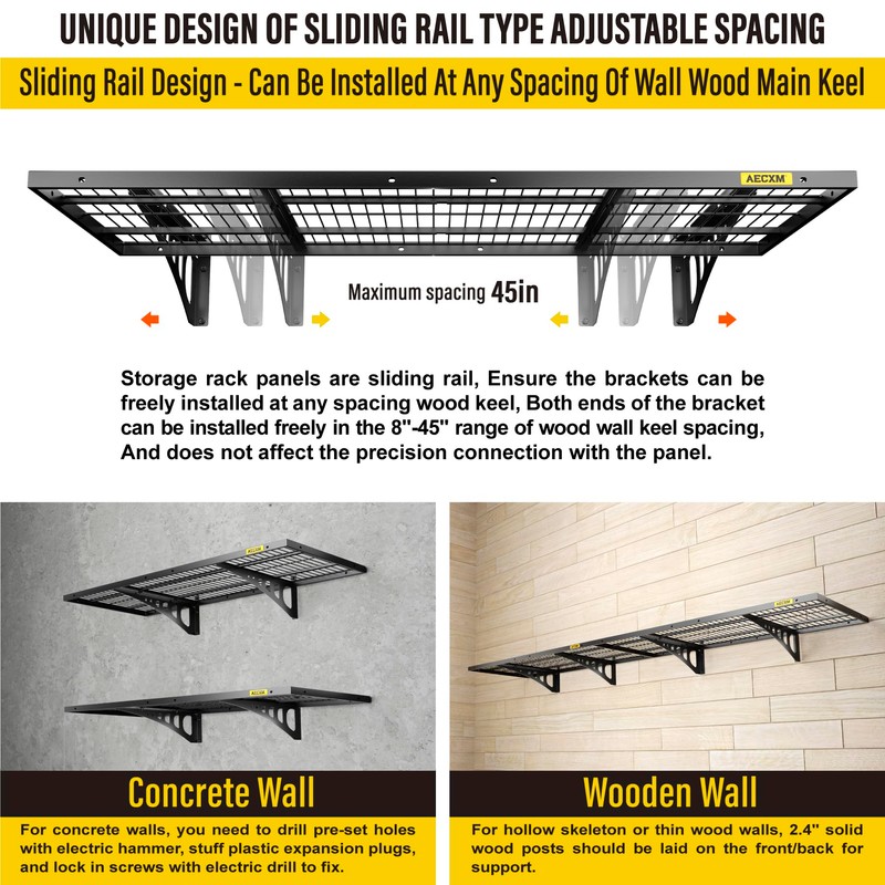 - INNOVATIVE UPGRADED DESIGN: Wall garage storage shelf is made of rectangular tube frame structure combined with thick iron wire mesh welding, The bottom of the panel is set with two sliding rails, Which not only makes the heavy performance of the storage rack stronger, But also the sliding rail design abandons the traditional fixed-point installation, And the two supporting brackets at both ends can be installed on the wood wall keel within the range of 8"-45" to connect with the panel precisely, And there will not be any problem that can't be connected due to mismatch of the wood wall keel spacing or inaccuracy of the brackets' installation, Which saves your time and labor