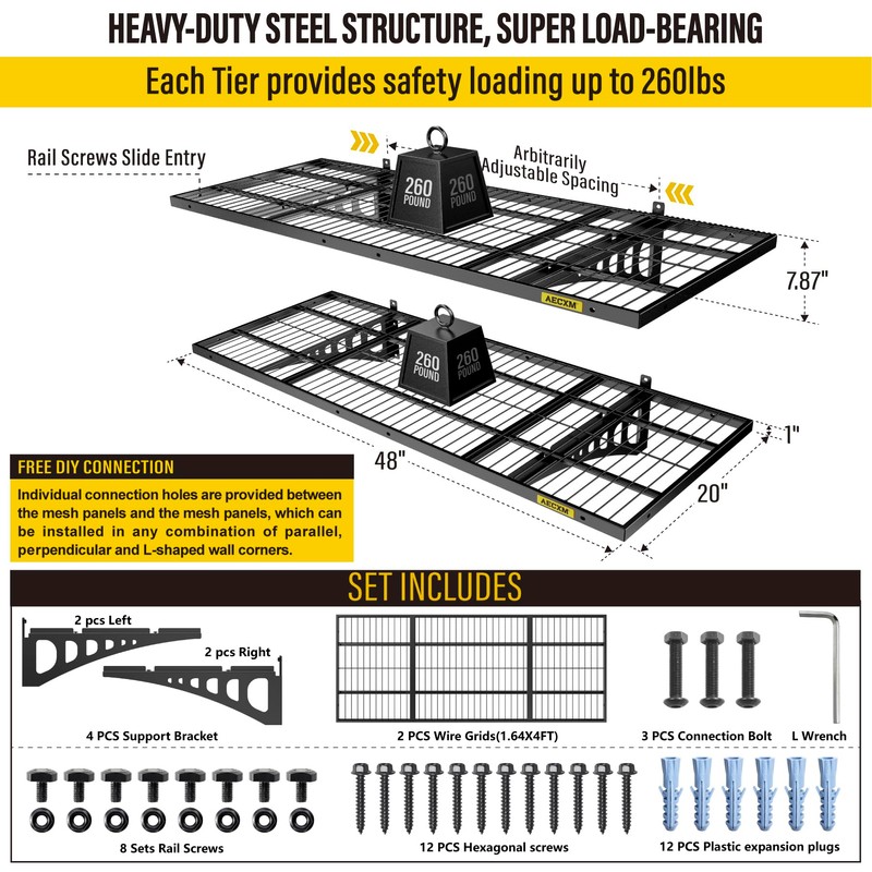 - SET INCLUDES:Includes 2pc-Grid Shelf; 4pc-Brackets; 12pc-Hexagonal screws (Hardened ∅0.2" L/2"); 8Sets-Rail attachment bolts; 1pc- Drill bit; 1pc-Wrench socket; 1pc-installation manual. All hardware accessories of AECXM series wall mounted shelves are under strict quality control and testing, we strive to provide our customers with a quality shopping experience, if you have any questions, please feel free to contact us