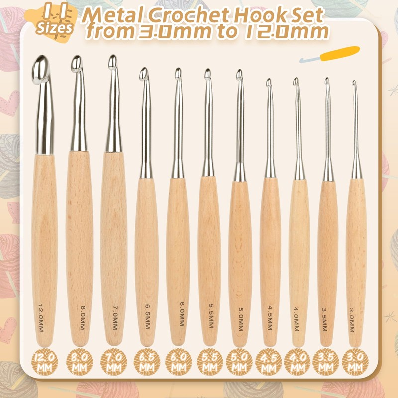 - Beech wood handle crochet hook set: The lightweight crochet hook with premium beech wood handle is available in 10 sizes from 3 mm to 12 mm (3 mm, 3.5 mm, 4 mm, 4.5 mm, 5 mm, 5.5 mm, 6 mm, 6.5 mm, 7 mm, 8 mm and 12 mm). The size is engraved clearly above the handle of each crochet hook, so you can quickly find the right crochet size when knitting. The long crochet hook set in full size is suitable for almost all yarn and wool, and you can choose as many crochet hook sizes as you need.