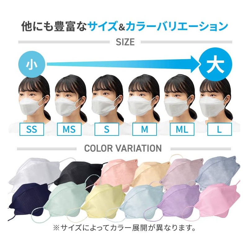 - 【多彩な色とサイズから選べる】サイズはSMLの他に子供用のSS、中間のMS、MLなど細かく選べます。カラーもスタンダードな白の他に、黒やパステルカラーも勢揃い。黒マスクは小顔にも見える効果も。