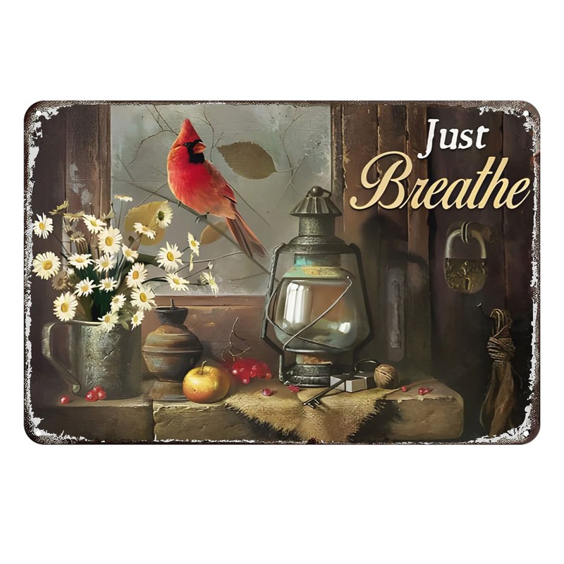 Aenaon Retro Tin Sign Cardinal Bird Just Breathe Metal Tin Sign Vintage Metal Tin Sign Funny Tin Sign 8x12 inch