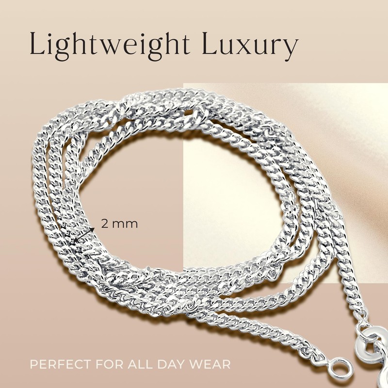 - ✨ POLISHING CLOTH INCLUDED: All our jewellery comes with a pouch bag and polishing cloth included in the price. We also promise a guarantee for 12 months against manufacturing defects. This necklace is available as 16, 18, 20, 22, 24, 26, 28 & 30 inches and features a spring ring closure. This is a finer silver chain (2mm width).