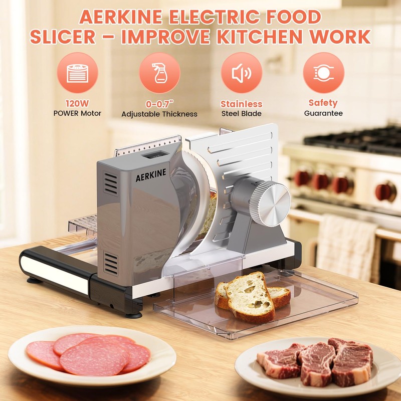 AERKINE Meat Slicer Machine for Home - 120W Deli Food Slicer with Removable 6.7" Stainless Steel Blades, 0-18mm Adjustable Thickness, Easy to Clean, Electric Meat Slicer for Meat Cheese Bread