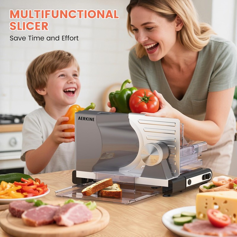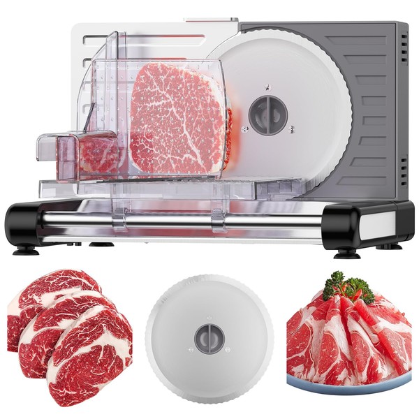 • 【POWERFUL MEAT SLICER FOR DELICIOUS CUTS】This electric food slicer features high slicing power and efficiency, low kitchen noise and a smoother experience. Stainless steel serrated blades can meet your daily meat cutting needs, such as frozen meat, luncheon meat, bread, cheese, sausages, cured meat, vegetables and fruits, etc. Whether for daily household use or preparing delicious meals for parties, this small meat slicer for home can be your most reliable kitchen assistant, making food preparation more efficient and enjoyable.