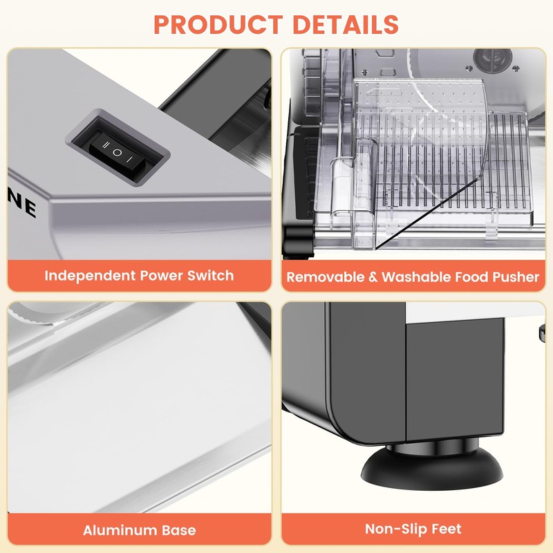 • 【STABLE AND SAFE KITCHEN TOOLS】The base plate of our thin meat slicer for home is made of aluminum, which is not only super durable but also rust-proof. Meanwhile, the non-slip suction cup feet keep the deli meat slicer stable during operation. When slicing, use a pusher to ensure safety, protect your hands and give you peace of mind during the slicing process. Note: Please slowly slide the ingredients onto the rotating blade of the electric meat cutter for slicing.