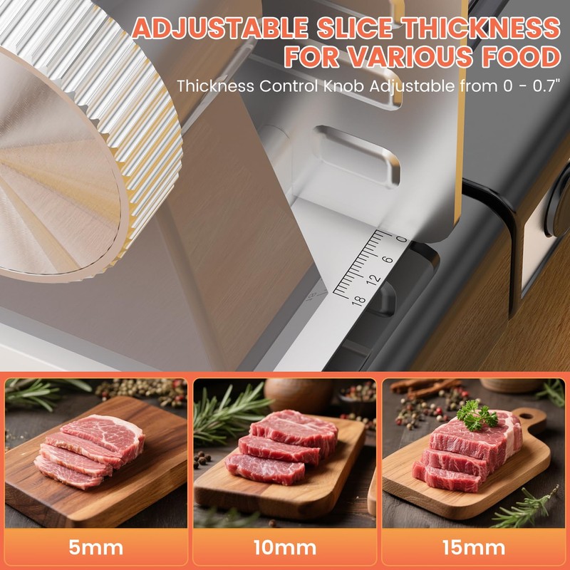 • 【PERFECT ADJUSTABLE THICKNESS FOR YOU TO CHOOSE FROM】You just need to rotate the thickness adjustment knob of the thin meat slicer for home to freely choose the thickness of the slices. The ideal slicing effect can be achieved through precise knob control. The clear scale markings of the meat cutter machine can easily meet the needs of various scenarios, allowing you to demonstrate professional-level slicing skills when making cold dishes, sandwiches or salads. This meat slicer for home is a kitchen must haves.