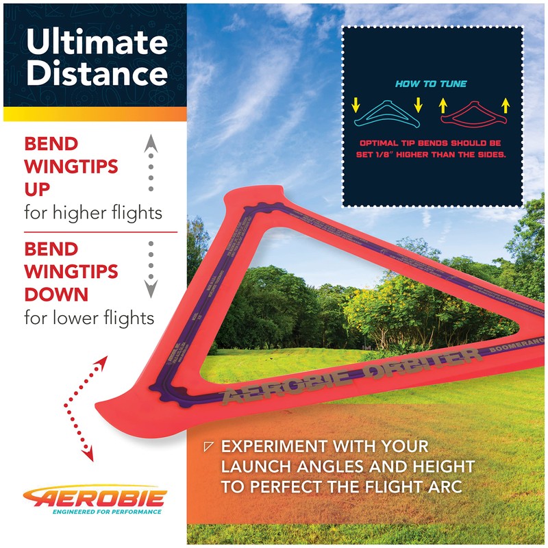 - ULTIMATE DISTANCE: Gently bend the boomerang's soft rubber wingtips up for higher flights and bend the wingtips down for lower flights; Experiment with your launch angles and height to perfect the flight arc