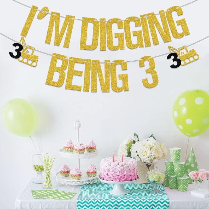 - Trendy and Fun: Our "I'm Digging Being 3" banner with glitter letters is perfect for 3rd Birthday Party Decoration. The banner is perfect decoration to add gladness and welcome your guests to your party.