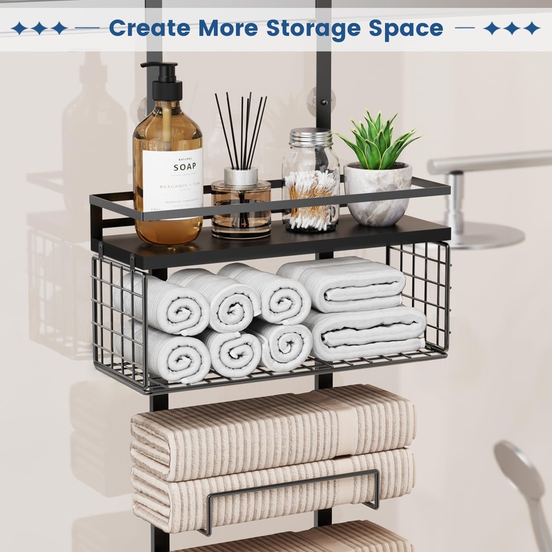 - [LARGE CAPACITY TOWEL ORGANIZER] This upgraded version of the towel rack increases the spacing, each layer can be placed two towels, while the top of the additional installation of the basket, the top space can also be used to fully realize the maximization of the increase of storage space function