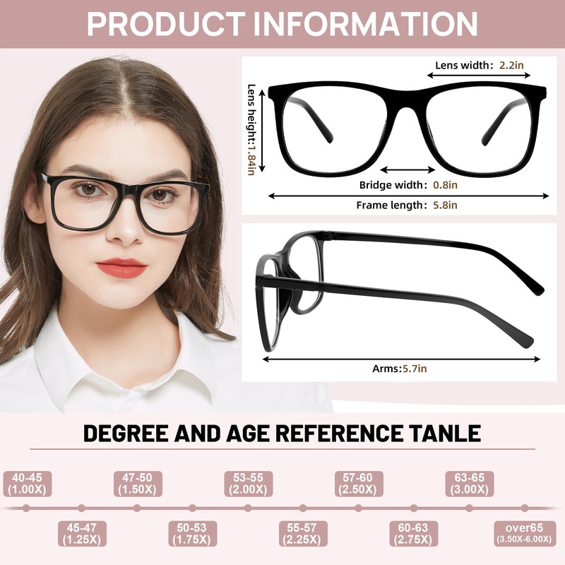 - Oversized reading glasses for women 2.0 : Black reading glasses with big square frame design are timeless. Not only embellishes face shape, but also give you a oversize look. Perfect suitable for large and wide face type ,or someone like this look. Tips: If you have a small face,please choose carefully, it may slide from your face.