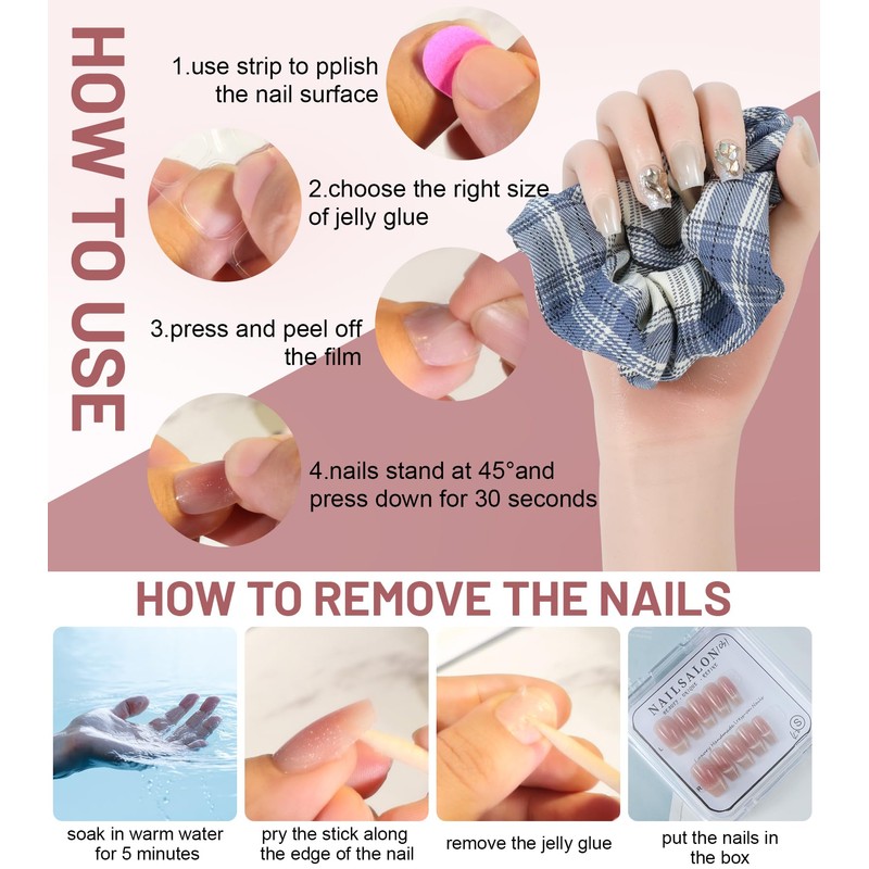 - Long lasting fake nails: Stay perfect for up to 7 days . Salon acrylic false nails; waterproof;non-toxins, no smell, no harm to your nails and health, which patches adhere seamlessly to your natural nails,just feel like real nails. No need to buy other things, you can get the nail salon-like effect.