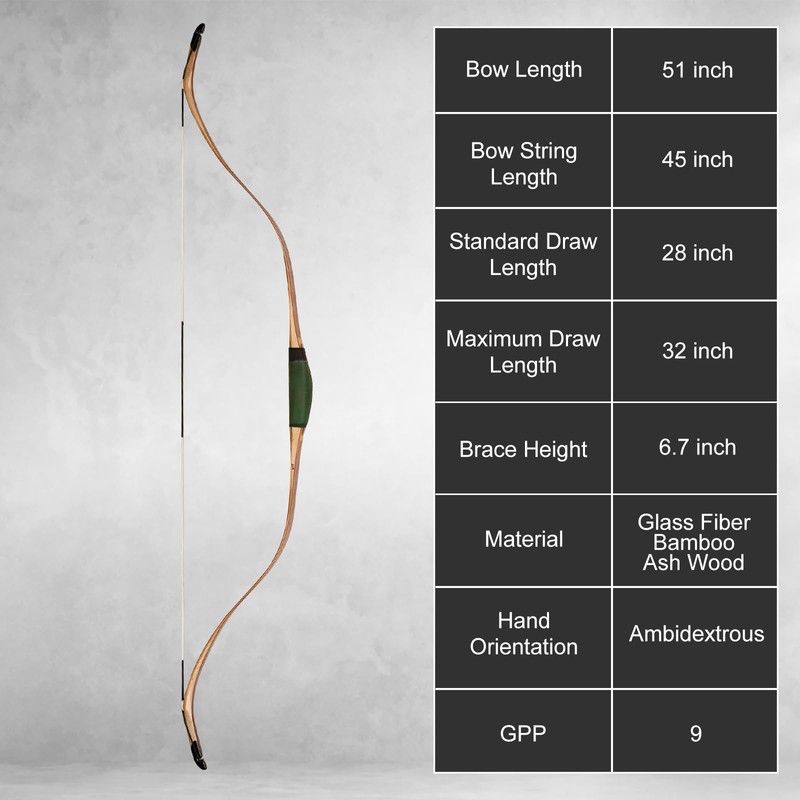 - [Bow Specifications] Suitable for both left- and right-handed archers, bow length is 51 inches, string length is 45 inches, Standard Draw Length 28inches, maximum draw length is 32 inches, Brace Heigth 6.7inches, draw weight 20lbs-60lbs.