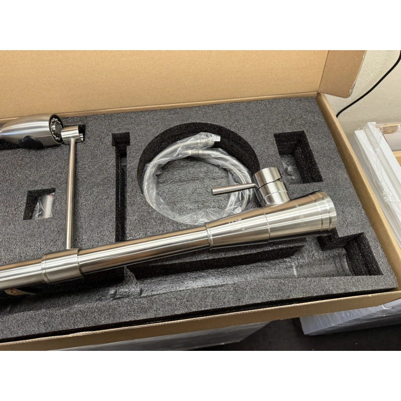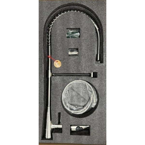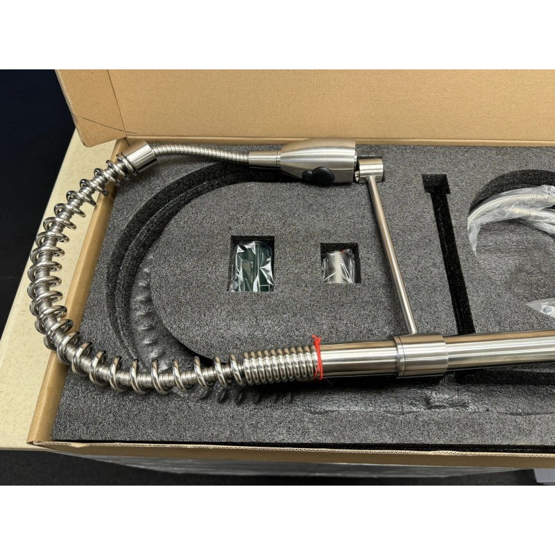 Enhance the functionality of your kitchen with the AFKPD01 Industrial High Arc Single Handle Stainless Steel Kitchen Faucet. Crafted with high-quality stainless steel material and finished with a brushed nickel, this faucet is a perfect blend of durability and style. The lever handle design and the pull-out feature make it easy to use and clean.
