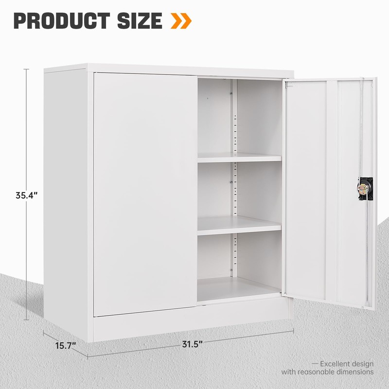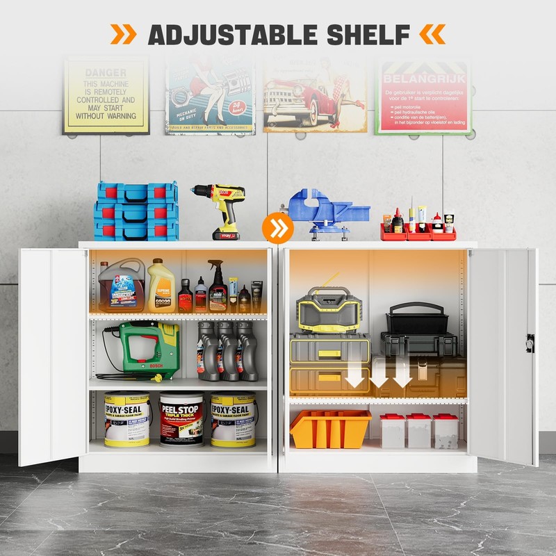 - 【Adjustable Height Shelf】▶▶ The Metal office storage cabinet has 2 adjustable partitions to accommodate items of different heights such as garage tool, books, toys, kitchen supplies and toiletries. Suitable for garage, bathroom, kitchen, living room, study, office, not only make your room or garage office neat and tidy, but also can save ample space.