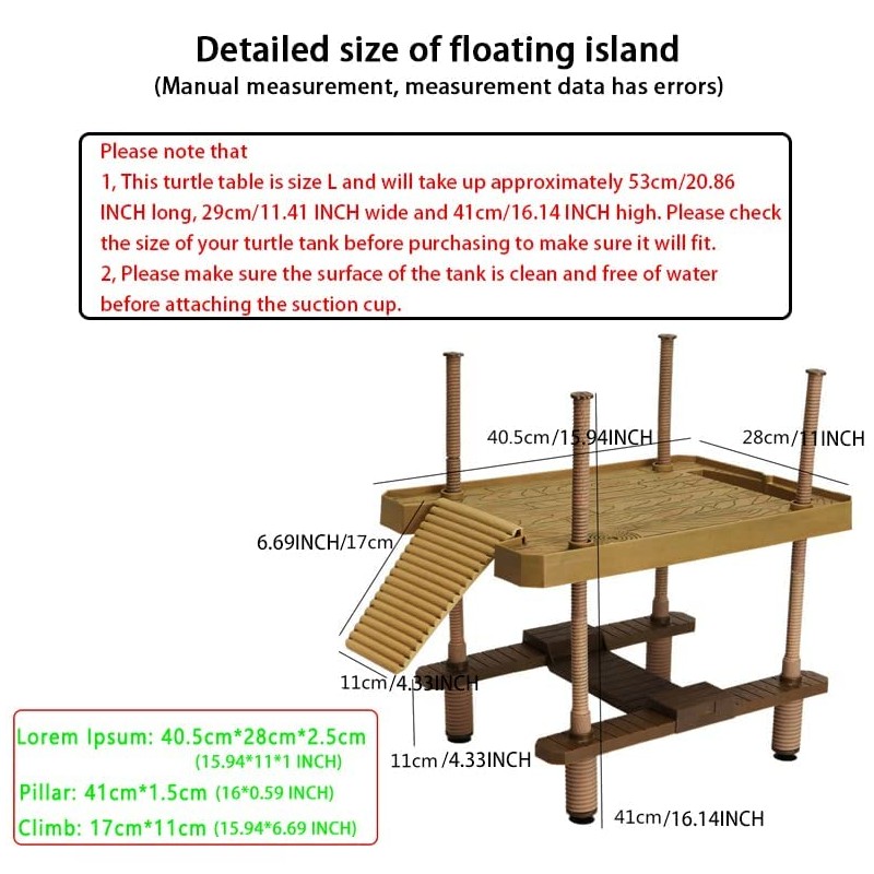- 【Please note】1. The space occupied by this turtle platform is: 53*29*41cm/20.86*11.41*16.14 IN(L*W*H), Please check the size of your turtle tank before purchasing to make sure it will fit. 2. Please make sure the surface of the tank is clean and free of water before attaching the suction cup. 3. Ensure that the column is naturally vertical after installation.