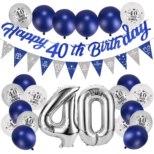 - Navy Blue 40th Birthday Decoration: Includes 1pcs 32 inch Number"40" silver foil balloons, 1 set "Happy 40th Birthday" Banner, 1 set triangle flags, 10pcs 12 inch blue latex balloons, 5pcs 12 inch sliver latex balloons, 5pcs 12 inch confetti balloons.
