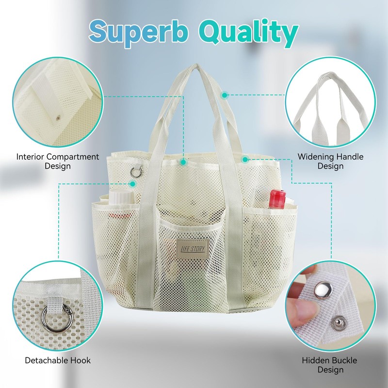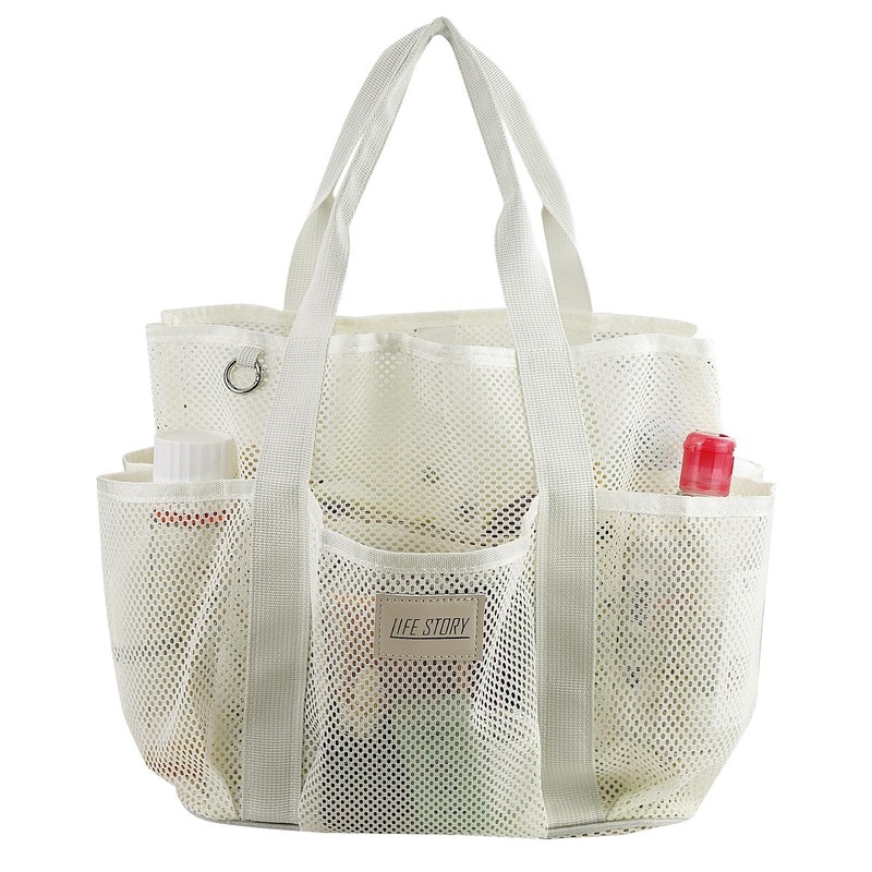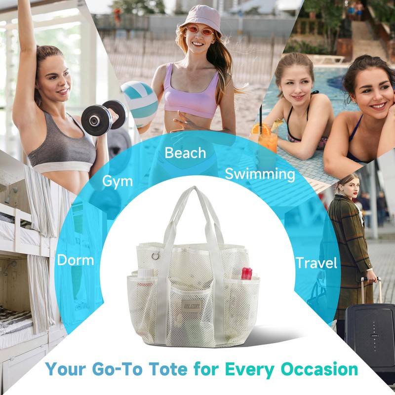 - Materials: This mesh holiday handbag is made of waterproof and sandproof polyester and mesh, which resists saltwater and sand. The fabric is thickened, scratch-resistant, and has excellent breathability to prevent moisture and mildew. It is not easy to break or tear under normal use and can be reused