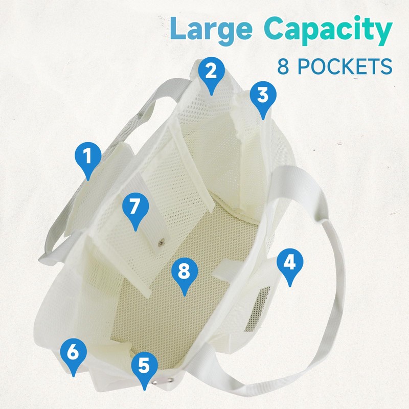AfitLulu Large Mesh Beach Bag for Women and Men, Lightweight Beach Hollow Mesh Bags with Snap and Removable Hook, 8 Pockets Sandproof Mesh Handbag for Beach Shopping Swimming (White)