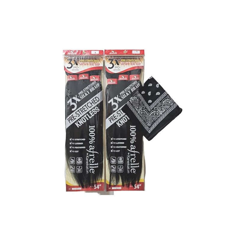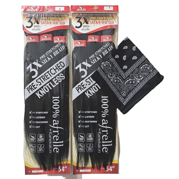 Afreezm Pre-Stretched Silky Braiding Hair 3X with Bandana - 2 Packs - 54 inches (#1)