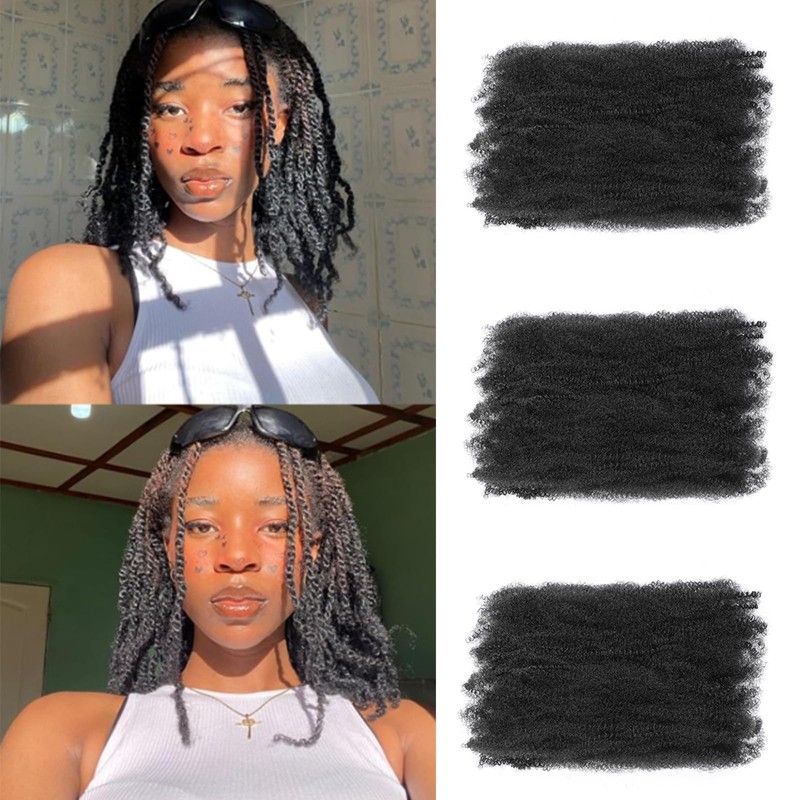 - 1. Hair Material: Our Afro Kinky Curly Braiding Hair Bulk is crafted from premium synthetic fibers, designed to mimic the texture and appearance of natural hair. It offers a dense, realistic look, perfect for creating stunning protective hairstyles like micro twists, braids, locs and crochet styles