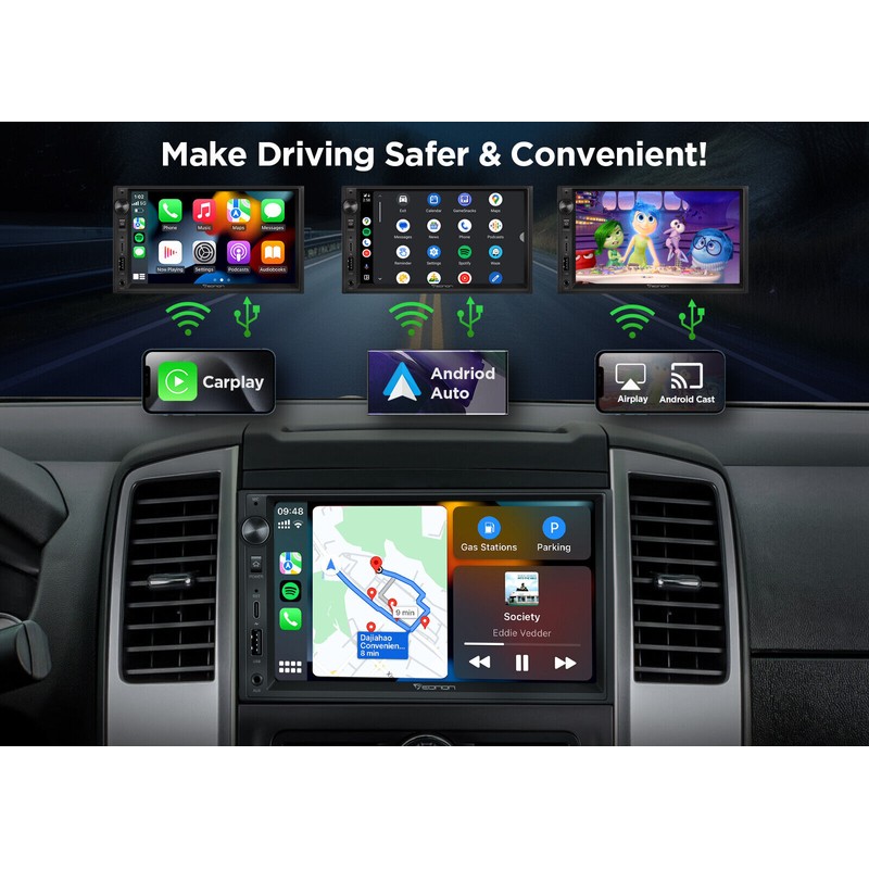 - 【Works with Wireless & Wired Apple CarPlay】 The smarter, safer and more fun way to use your iPhone in the car. Apple CarPlay brings the things you want to do with your iPhone while driving and puts them right on this double din touchscreen car radio. You can get navigation, make calls, send and receive messages, and enjoy your favorite music. With Siri Voice Control, you could control the device with a word or a touch, very convenient.