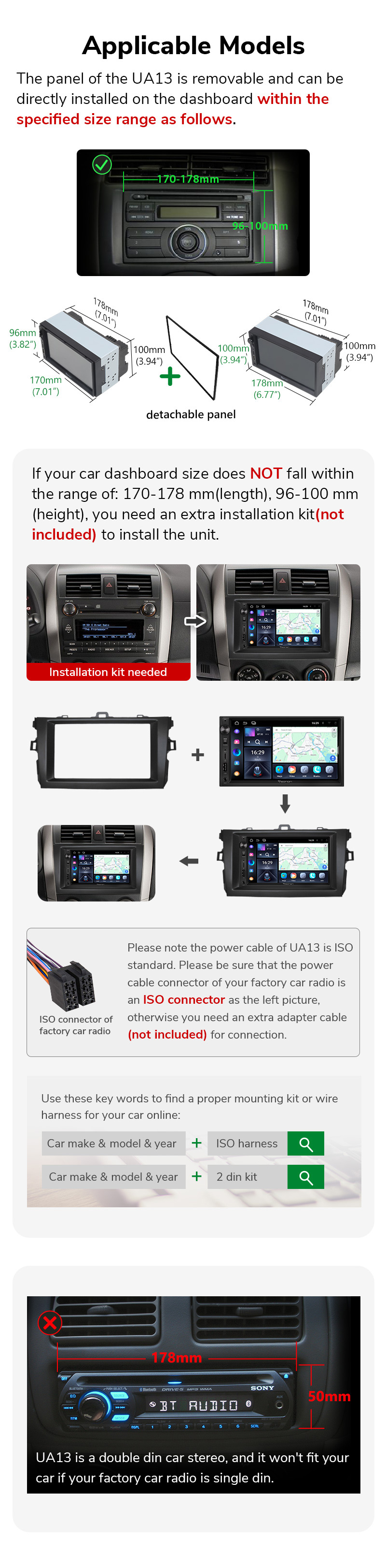 2. UA13 is Double Din Head Unit. Please measure your dashboard size. If the installation size of your car dashboard falls within the range of 170*96mm to 178*100mm and your car’s connector is an ISO connector, this unit can be installed directly. If not, you need to install it via a mounting kit or wire harness. The mounting kit or wire harness need to be purchased separately.