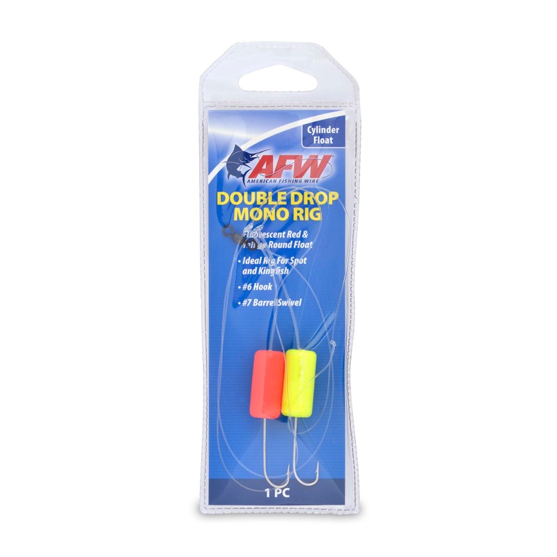 Designed for serious surf and pier anglers, the AFW Double Drop Mono Rig is your all-in-one solution for targeting high-performers like spot, kingfish, croaker, and whiting. Built tough with 45 lb clear mono line, two #6 plated hooks, and a strong #7 barrel swivel, this rig’s made to stand up to strong currents and strong runs. Its secret weapon? Fluorescent red and yellow floats that keep your bait suspended above the bottom — where it’s most visible to fish and less accessible to bait-stealing crabs. Whether you’re fishing shrimp, squid, or cut bait, this rig keeps your offering in the strike zone longer. Available with both round and cylinder-style floats (1 in / 2.5 cm) to match your water conditions. Easy to use, no fancy setup needed — just tie it on and fish. Great for anglers of all skill levels looking to increase their catch rate on the surf or pier.