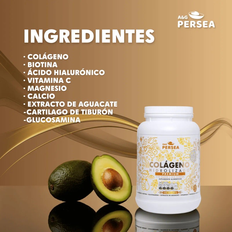 - Colágeno Premium 100% Hidrolizado sin Sabor | A&G Persea | 1.2 kg A&G Persea es una marca líder en suplementos de alta calidad en México, con más de 5 años en el mercado. Somos la única marca que combina colágeno 100% hidrolizado con cartílago de tiburón, glucosamina y extracto de aguacate, una fórmula única y avanzada para el cuidado integral de articulaciones, huesos, piel, cabello y uñas. Fórmula premium enriquecida con biotina, ácido hialurónico, vitaminas y minerales esenciales. Ideal para personas que buscan fortalecer su cuerpo desde adentro, con ingredientes de origen natural y alta biodisponibilidad. Beneficios: