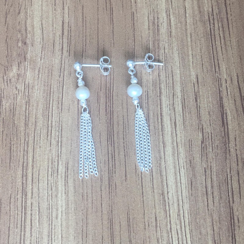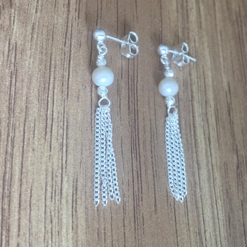 Aretes de plata ley .925 con perla natural cultivada. Hermoso diseño de aretes de plata con perla natural cultivada engarzada con 4 cadenas colgantes que le brindan el largo ideal para verse elegantes y clásicos al mismo tiempo. De fabricación artesanal estos aretes largos te harán lucir radiante en esas ocasiones especial. ¡Muchas gracias por apoyar lo Hecho en México! Medidas: Largo 3.5 cm. Perla: 4 mm.