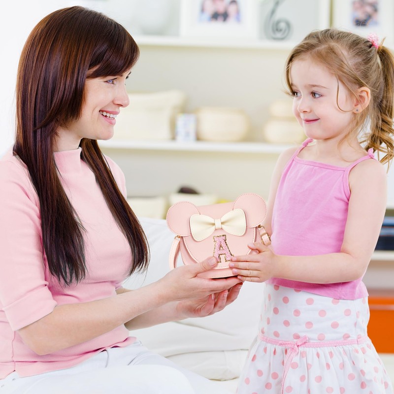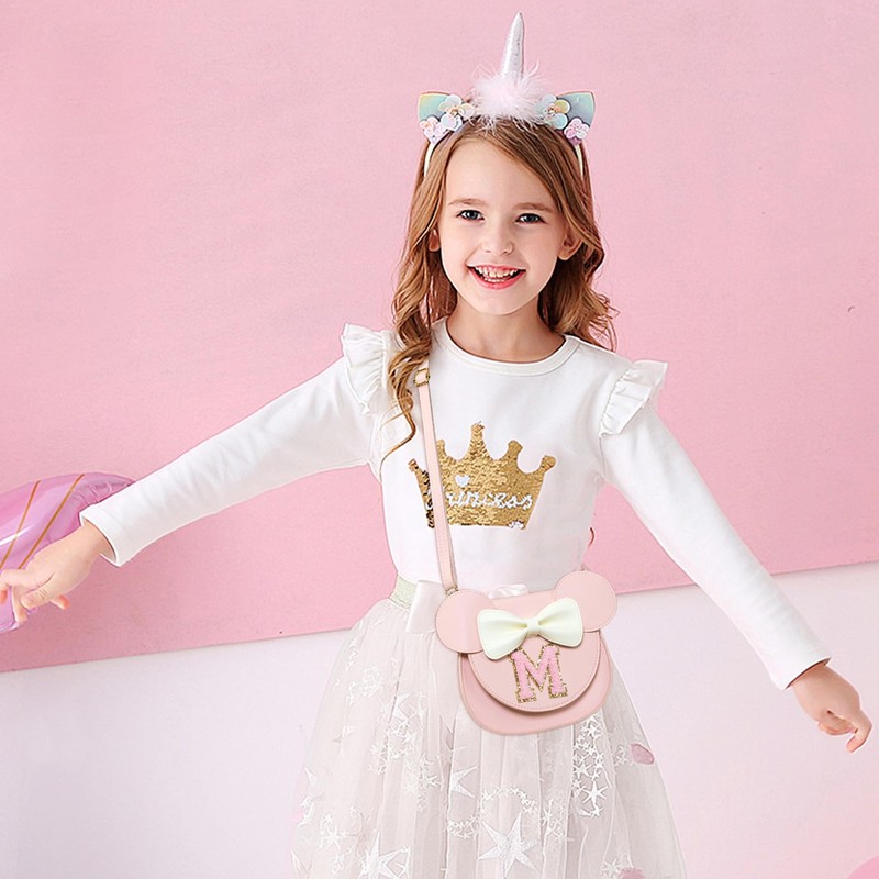 - 💝[ Carefully Designed Girls Purse ] Cute girls crossbody bag, creative design and pretty color combinations can better meet the aesthetic needs of little girls. Every little girl purse is personalized. Not only does it have cute mini mouse ears, but girl's initial on the front, so she feels like it really belongs to her. Especially with the charming bow, adds a touch of sophistication to this cute accessory bag. The magnetic snap closure, it is easy for kids to open and close.