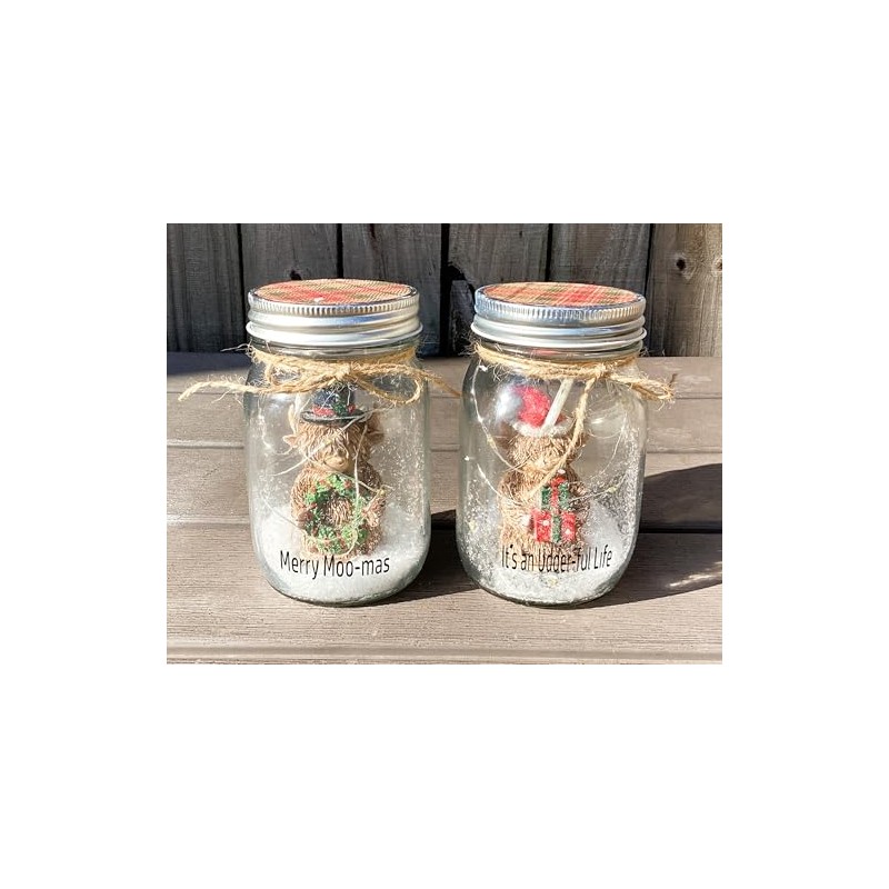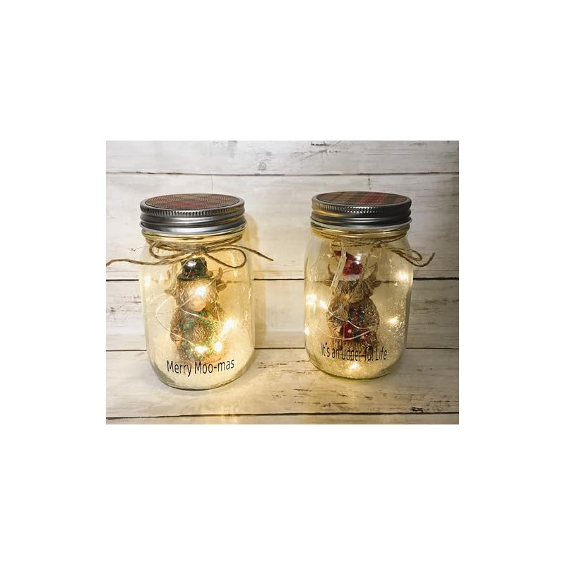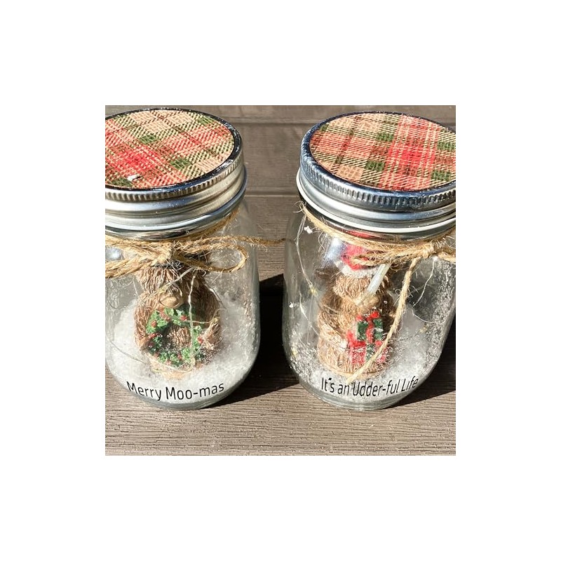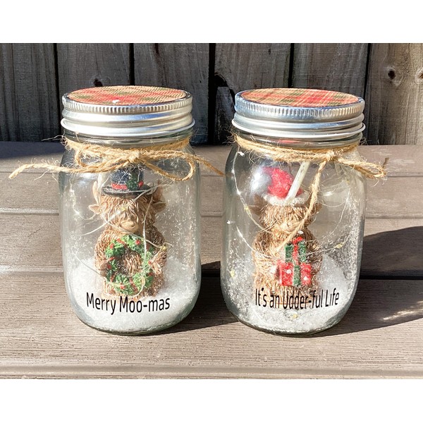 ITEM: Christmas Decor - Highland Scottish Cow Lighted Mason Jars 2pc DETAILS: Resin figurine in a clear glass mason jar with LED light lid. Filled with dry chunky snow AND glitter for special effects. (Not water filled). See picture for details. SIZE: Standard jar 7 x 3.5-inch approx. (EACH) MFR: Agape Gifts Designs ~Agape Gifts Designs are handcrafted decor & gifts made with quality materials. This item may be listed on multiple channels/websites and may sell out before we can adjust the listing. No custom orders accepted on this item. First come, first served. ~